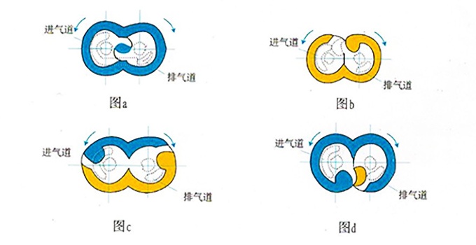 下(xià)圖為羅茨轉子由(you)0°到360”的抽氣過程。在(zai)0位置時(圖a),進排氣(qì)道關閉,吸氣腔與(yǔ)排氣腔溝通,泵腔(qiāng)内壓力均衡相等(děng)。當兩個💯轉子✌️旋轉(zhuan)到50°時(圖b),形成負壓(yā)腔,進氣道打開,正(zheng)壓腔壓力逐漸提(tí)高。工作過🔞程中,此(cǐ)位置是轉子正好(hao)處于換向泵腔壓(ya)力平衡的瞬間,轉(zhuan)子從該位置再轉(zhuǎn)過一定角度,則轉(zhuan)子開始密封分割(ge)💯為吸氣腔與壓❌縮(suo)排氣腔兩部分,此(ci)時開始做功。次位(wei)置進氣口打開,随(sui)着轉子的繼續旋(xuán)轉負壓腔溶劑逐(zhú)漸增大開始吸🌍氣(qi),排氣腔容積逐漸(jian)減小,由于排氣口(kou)尚未打開,因此氣(qi)體被壓縮,壓縮量(liang)随排氣✔️口上線位(wei)置的變化而變❄️化(huà)。當轉子旋轉到155”時(shi),此時負壓腔繼續(xù)進氣,排氣道打開(kāi),開始排氣。此位置(zhì)時泵的吸氣做功(gōng)繼續進行,排氣🌈口(kǒu)開式打開,被壓縮(suō)的氣體快🈲速排入(rù)下一級泵腔。當轉(zhuǎn)子旋轉到312”時,進排(pái)氣口關閉,次位置(zhi)⛹🏻♀️轉子做功以完成(chéng)一個周期,此時泵(bèng)腔内壓力逐漸恢(huī)複均衡狀态。(圖d)此(ci)位置又回到初始(shǐ)位置,随着泵轉子(zi)的連續旋轉,吸氣(qì)和排氣過程循環(huán)進行,實現了泵的(de)連續抽氣做功,實(shí)現了✍️抽真空的目(mu)的。轉子每轉一周(zhou),吸氣和排氣各進(jin)行一次。